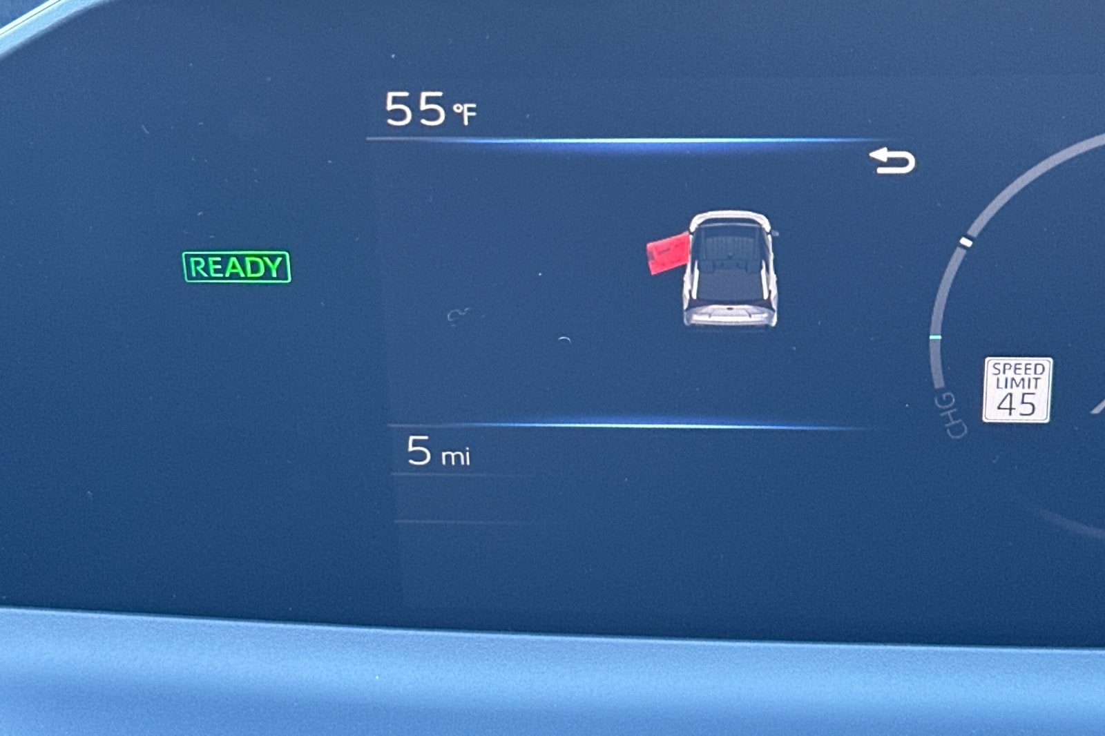 • Top-mount Multi-Information Display (MID) with indicators and 7-in. LCD display with speedometer, charge meter, power output meter, drive mode indicators, instrumentation and customizable settings, odometer, tripmeters, clock, outside temperature, rear passenger seatbelt indicators, fuel economy information, trip timer, charging information and settings, and warning messages