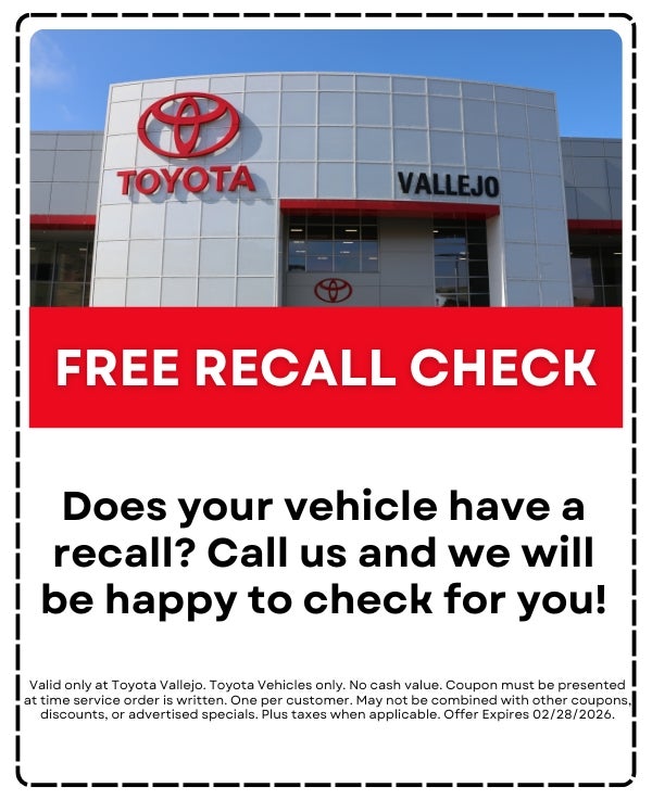 By clicking this box, I agree to receive in-person or automated telemarketing calls and texts from Toyota Vallejo at the number I entered. I understand that my consent is not required for purchase.